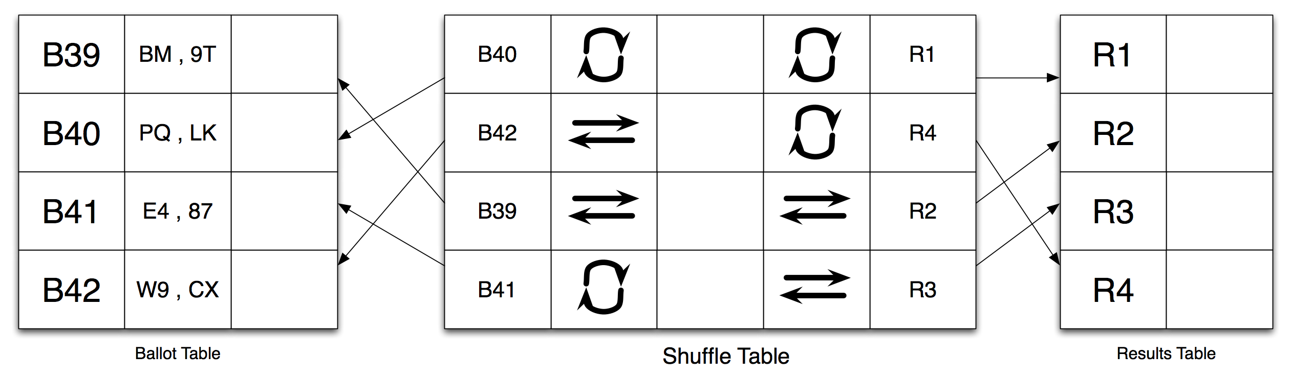 So the votes have been cast, the uncertified tally has been released, and the confirmation codes have been published for all voters to check. Now, it’s time to make sure that the coded votes, which were shuffled via the Shuffle Tables into the decoded votes in the Results table, were indeed shuffled and decoded correctly.